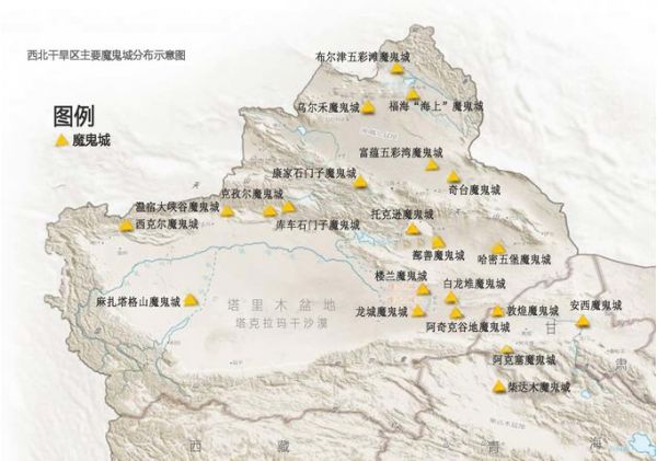 从地图上我们可以明显看到,北疆是魔鬼城的主要分布区域,甘肃、青海也有少量分布,实际上,在西北资料可查的雅丹地貌群就近百余处,它们一个个神秘地屹立在西北疆域上,成为了寂寞荒原上的一场视觉盛宴,数量之多,形态之多,就像是一个神秘而庞大的“魔鬼”家谱,实际上,它们并不是被人类遗弃或鬼神建造的“古城”,而是经过风蚀形成的一种特有地貌景观,用我的话讲就是被风吹了多少年的一堆大土丘~可是深入其中,高高低低的“建筑群”投下错乱光影,在这里几乎看不到任何生命的迹象,因为铁含量过高,磁场不稳定, 指南针进入雅丹地貌经常会不管用,尤其在夜深人静,遇到风吹,声音似鬼哭狼嚎,极其阴森恐怖,故被称为“魔鬼城”。如果晚上在魔鬼城里露宿一夜,想必也会是一种奇妙的体验~