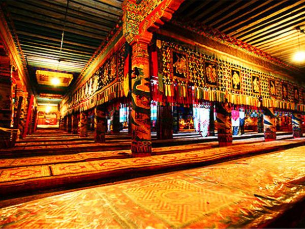 大经堂始建于明万历三十四年(1606),毁于火,1917年重建。土木结构,为藏式双层平顶建筑,汉式楼阁遥相互映。经堂面阔十三间,进深十一间。面积1981平方米。堂内四壁存放着数百册经卷。