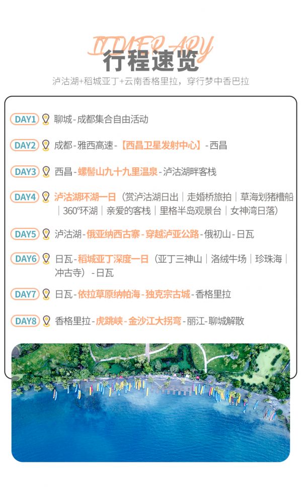 5、服务 :由经验丰富的司机供向导服务;全程配备无人机,司机带你360°航拍玩转泸亚,发现常人看不到的美。