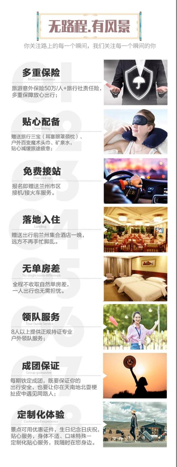 服务:8人以上提供正规持证专业户外领队服务;8人及以下由经验丰富的司机提供向导服务。保险赠送旅游意外保险,旅游意外保险最高赔付50万元/人(外宾另议),购买旅行社责任险;保险不含财产险,请游客保管好自己的财物;因旅行意外造成的客人意外伤害,按保险公司规定赔偿,我方不承担另外的赔偿责任;如游客有需要可自行购买其他保障险。