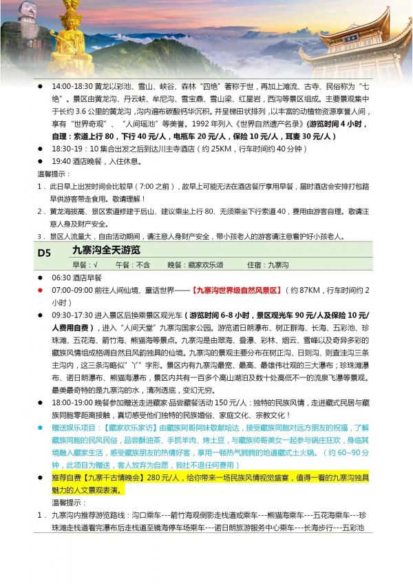 四川双飞8日游 聊城出发 纯玩 无购物 成都 黄龙溪 乐山 峨嵋山 九寨 黄龙 都江堰 熊猫乐园 ...... 发团日期 20230612 20230619 20230703 价格 3380 3580 报名电话 0635 8681234