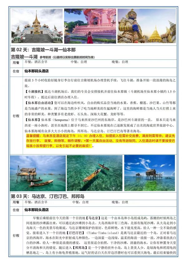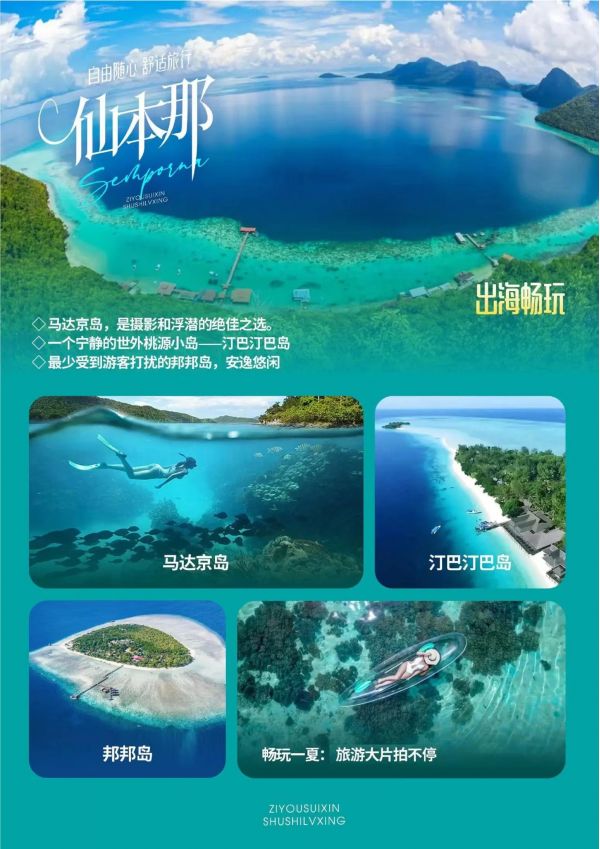 仙本那纯玩6日游 聊城发团 纯玩 无购物 马达京岛 汀巴汀巴岛 邦邦岛 马布岛 卡帕莱浮潜 ...... 发团时间 20230615 20230706 20230726 价格 8999 9999 10999 报名电话 0635 8681234