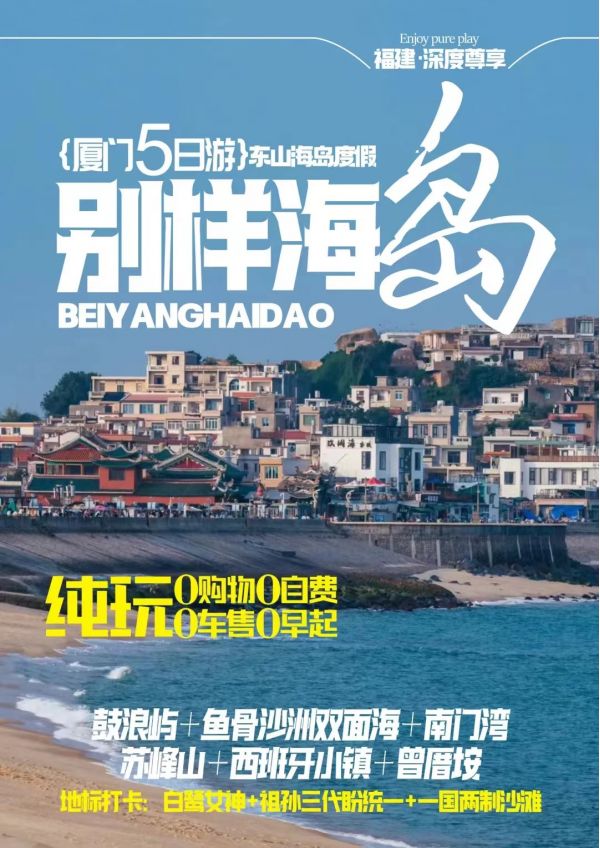 厦门、夜宿鼓浪屿、旅拍鼓浪屿、东山岛鱼骨沙洲双面海、西班牙卡达凯斯小镇深度游双飞五日(行程供参考,导游在不减少景点的情况下会根据实际情况相应调整游览顺序)