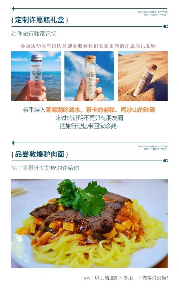 tips:西宁集合酒店为赠送酒店,酒店以实际安排为准均不退不换不指定,如要更改酒店产生的费用需要自行承担。(4)品尝敦煌驴肉面。