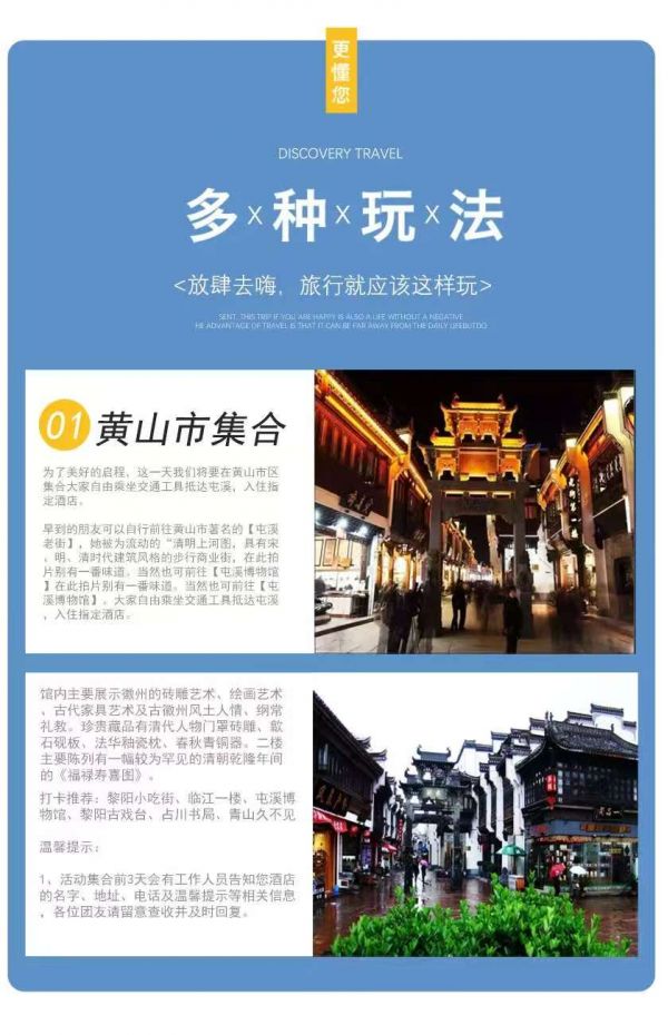 【集合地点】黄山市黎阳老街,出发前三天短信通知酒店