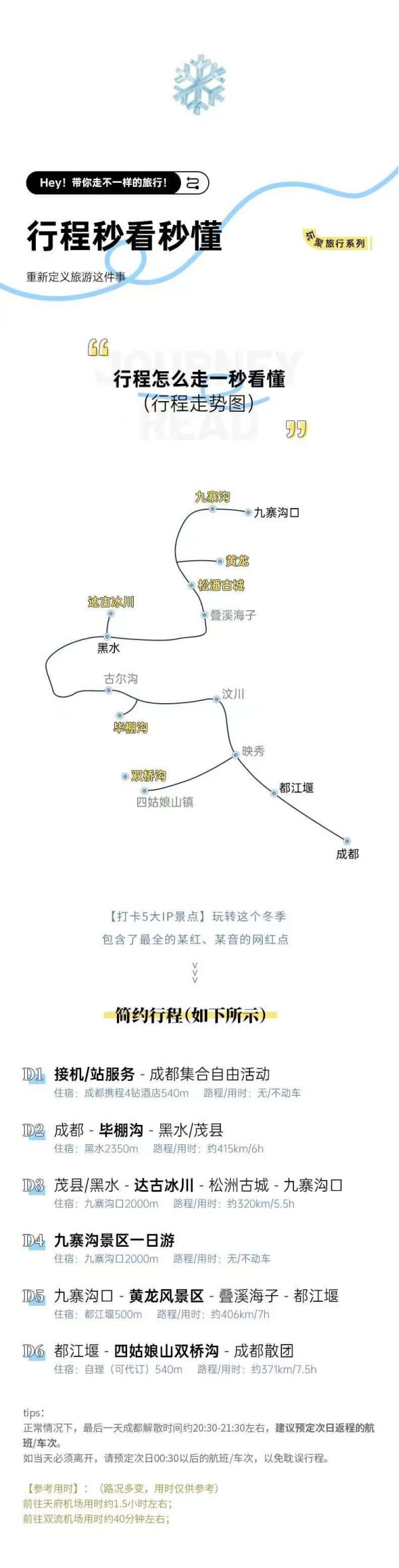 2. 由于川西地区路况复杂,山道狭窄,有可能因为堵车而发生延误,请大家尽量预定第二天返程的航班或车次。