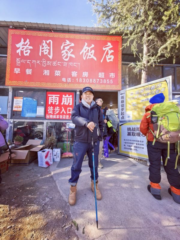 走到笑农大本营,大家靠着木栏杆歇脚,看着远处的雪山,刘会长说:“当年的伐木场,如今成了徒步者的驿站,时光真是奇妙。”