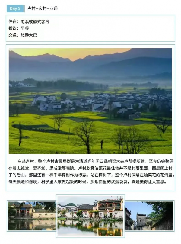 住宿:5晚屯溪标间住宿或婺源一晚农家住宿和西递客栈住宿