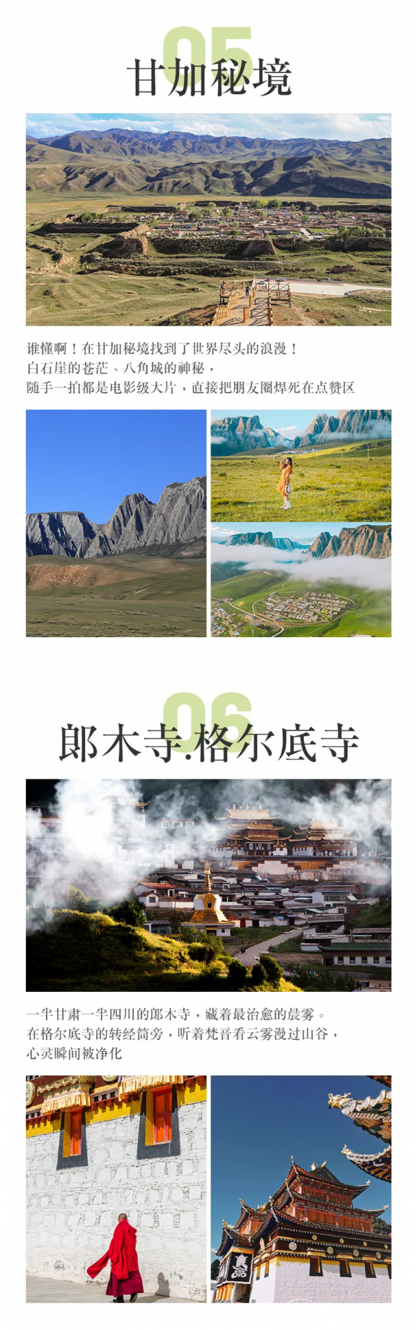 包含甘加秘境门票、格尔底寺门票、扎尕那门票、若尔盖花湖门票、九曲黄河第一湾门票、莲宝叶则门票、米拉日巴佛阁门票