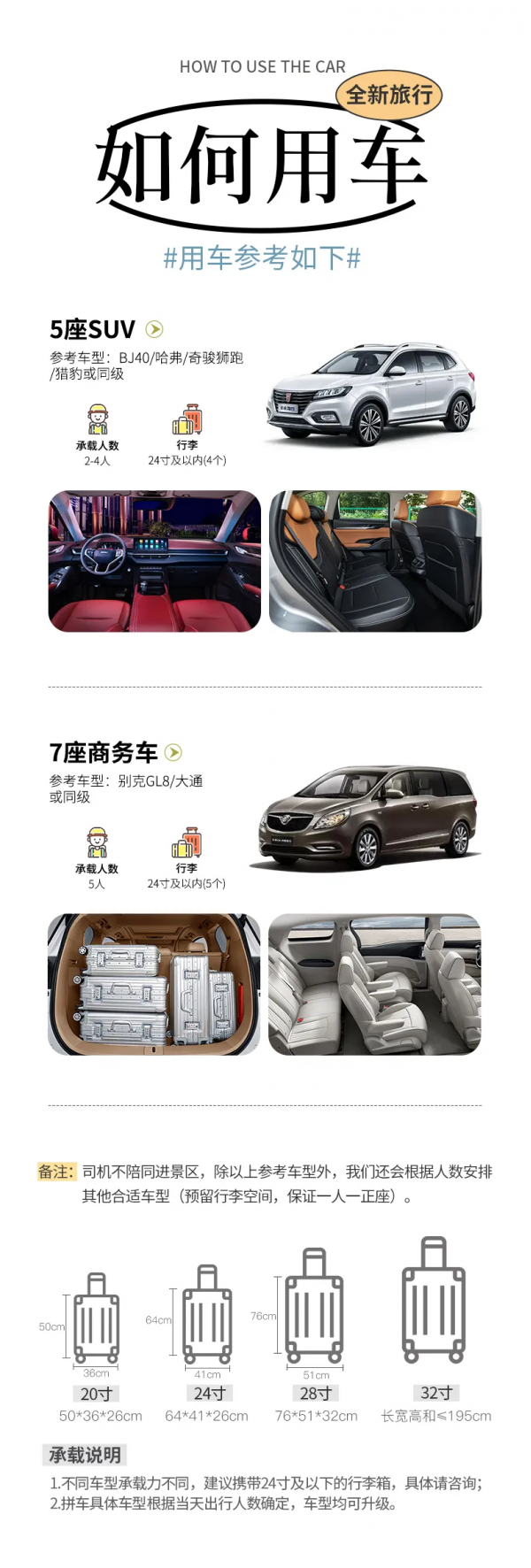 备注:车型承载力有限,携带行李为24寸或以下行李箱;