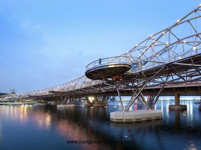无论是从桥面,还是从五个观景平台望去,螺旋桥都使城市的天际线更加壮观。双螺旋中的内螺旋用于支撑遮阳的多孔玻璃和不锈钢网状天篷。不锈钢表面可产生绚丽的夜晚照明效果,因为它们能反射桥体中内置的、用于增强设计美感的特殊灯具的光线。