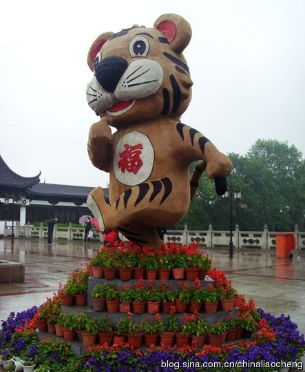 一只小老虎站立在那里,五颜六色的花围绕。鲜红的“福”字在虎的雕像上,看到此雕像的人一定会“福如东海”吧。