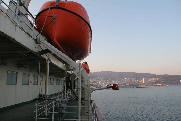 看,这艘船的甲板上,既有提醒游客的热心性。还为甲板上增添了一道亮丽的风景线,而翻译成的韩文,就足以说明了威海码头的国际性。