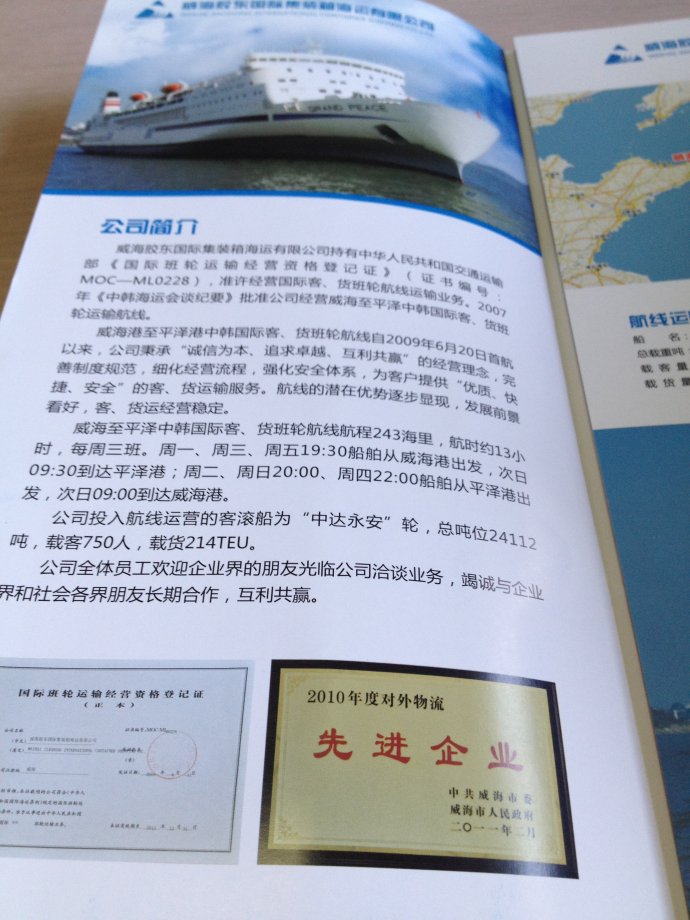 这是威海胶东国际集装箱海运有限公司的简介以及他们所获得奖项,而看到这些也让我对威海码头更加从满了信任。