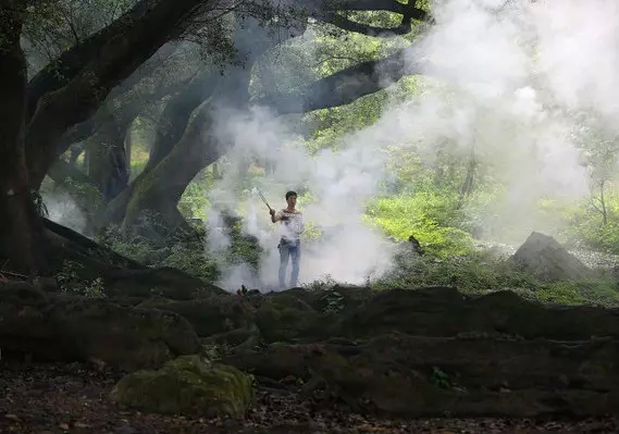静静地等待一会儿,太阳出来了,拍摄时机成熟。老王开始招呼他的助理——另外两个村民,在榕树后面开始放烟饼。