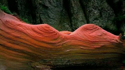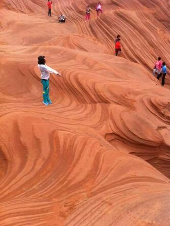 波浪谷是一种红砂岩地貌,因岩砂上的纹路像波浪,被叫做"TheWave",即波浪。上世纪80年代,人们在美国亚利桑那州和犹他州交界处发现了波浪谷,神奇的外观和极高的科研价值使其成为了世界八大岩石奇观之一。而靖边的波浪谷也有着与美国波浪谷媲美的红砂岩峡谷。中国靖边波浪谷和美国波浪谷的差距并不大,都是红砂岩地貌,靖边波浪谷更加年轻,只有6000万年,很多砂土还没来得及凝固为岩石,地处黄土高原与毛乌素沙漠交汇地带的靖边县龙州乡。