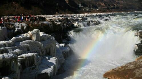 观赏黄河壶口瀑布黄河壶口瀑布,其奔腾汹涌的气势如同中华民族的精神。它西临陕西省延安市宜川县壶口乡,东濒山西省吉县。黄河至此两岸石壁峭立,河口收束狭如壶口,故名壶口瀑布。瀑布落差9米,蕴藏丰富的水力资源。奔腾的黄河水声震天地,绚丽的彩虹美轮美奂,轻烟生水底,冰挂透晶莹,黄河壶口冬季美丽的自然景观让游人们流连忘返。