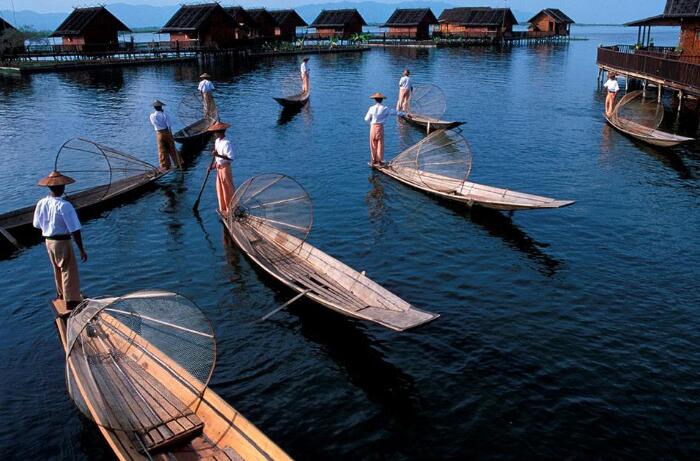 饭店内早餐后,乘坐当地特色游船游览风光旖旎的茵莱湖。茵莱湖是缅甸第二大湖,三面环山,水质清澈,湖底水草清晰可见,湖水的颜色随着每天日出日落而发生变化。当地茵达族人的村寨依湖而建,高脚屋、学校、商店等各种生活设施均伫立水中,当地人的饮食起居均依湖而生,交通往来全依靠船只,是名副其实的水上村寨。当地人特有的划船方式是站在船尾,手脚并用的划船。乘船参观坐落在湖上的【水中佛塔】,在此可以欣赏俗称【猫跳寺】的【波道乌寺】中的缅甸猫在寺中僧人的训练下,可以为游人表演钻圈,寺中的五世佛像是艳丽湖的至尊,寺中的佛塔金光灿灿,全寺全部由柚木建成,木雕技艺精湛,其本身就是一座艺术宝库;参观水上【手工织布制衣作坊】、【卷烟作坊】、【铁器生产作坊】,与【长颈族家庭】拍照,参观当地每周一次的集市【水上市场】,领略缅甸独特的水上村寨生活。午餐在风光奇美的【水上餐厅】用餐,品尝湖中的特产鱼。晚入住水边的木屋别墅。