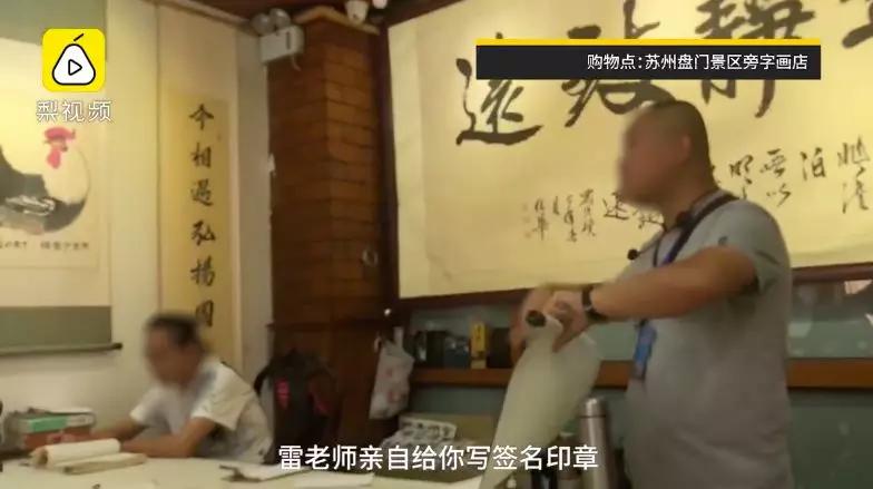 在购物点苏州盘门景区旁字画店里,游客们又被忽悠买来历不明大师的字画。