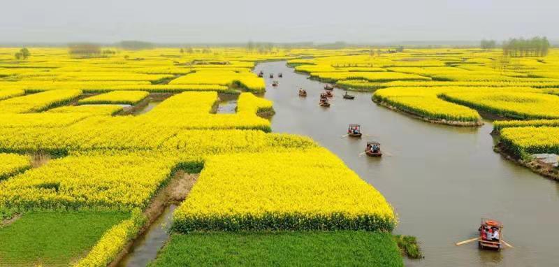 早上我们前往“中国最美的油菜花海”──【千岛菜花风景区】,千岛菜花景区被称作“中国最美的水上油菜花”三月至四月便是此最美的季节,座落在河网纵横的缸顾乡,一条条的小河又分支出一条条的小沟,南北东西延伸开去,把一整块的田分列割成了千百个“小岛”,这种“小岛”兴化人把它称作“垛”。垛子只比水面高出一点点,整齐划一地排着,就像是列队检阅的方阵,气势恢宏,波澜壮阔,登上20多米高的观光瞭望台,极目远眺,满眼尽是金黄色的菜花,形成一道独特的自然风景,身临其境,心旷神怡;