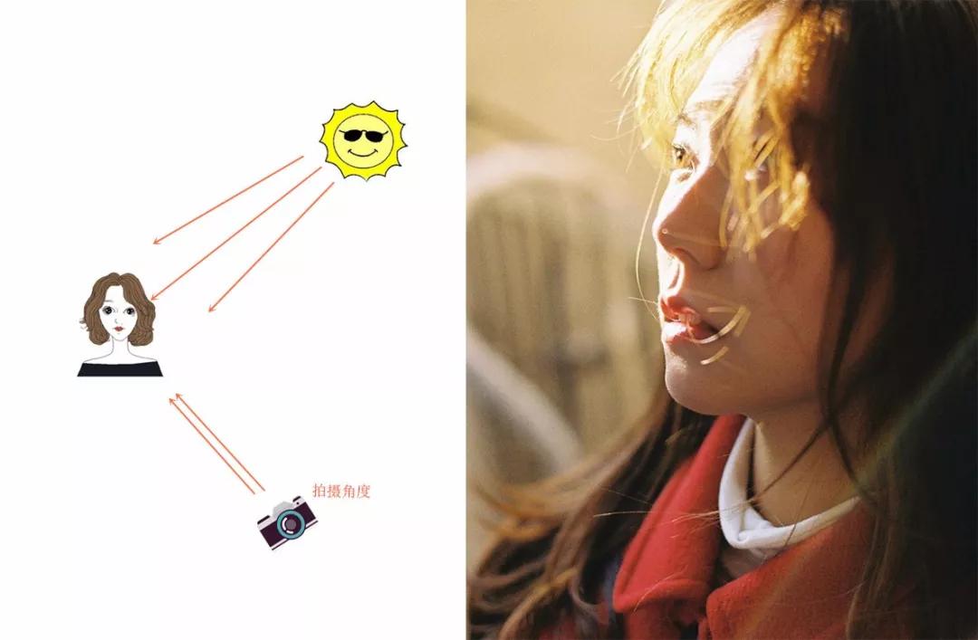 上面讲的是逆光拍摄,还有一种是侧逆光拍摄,当太阳光线处在模特左边或者右边,就是侧逆光。