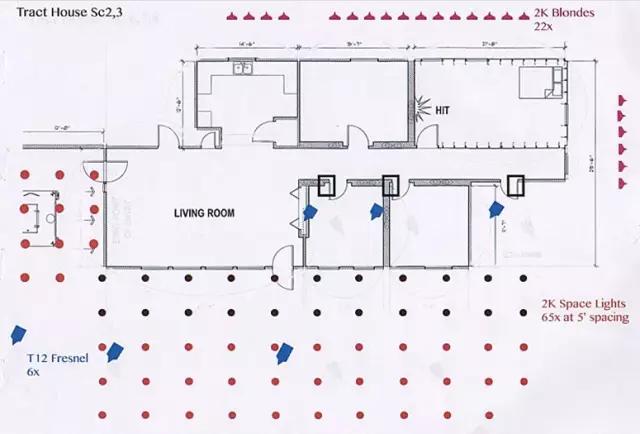 Deakins: 我的图只是粗略的设计,只是用来和我的灯光师沟通,看哪里需要什么灯。T12和天空灯是事先安装好的,但这些灯不是用来照演员脸的,T12没法照那么远。