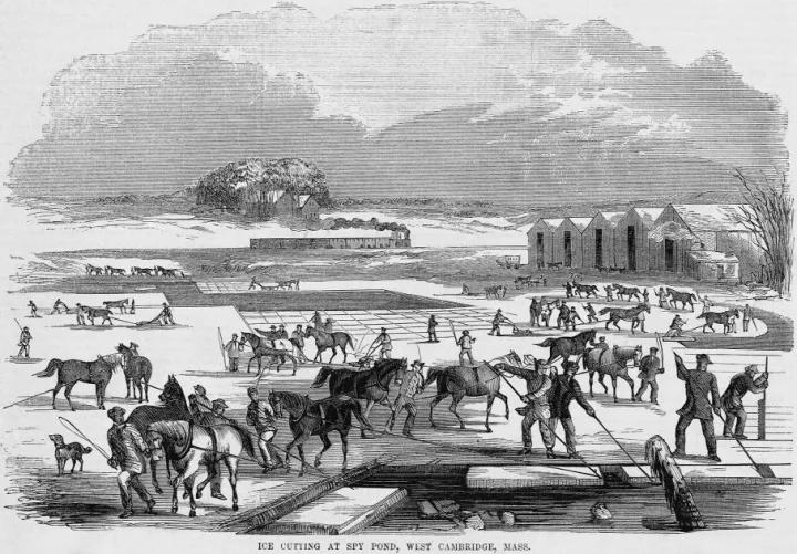 Spy Pond, Arlington 开采河冰的场景。都铎的手下发明了一种用马拉着的铁质刀具切割河冰。