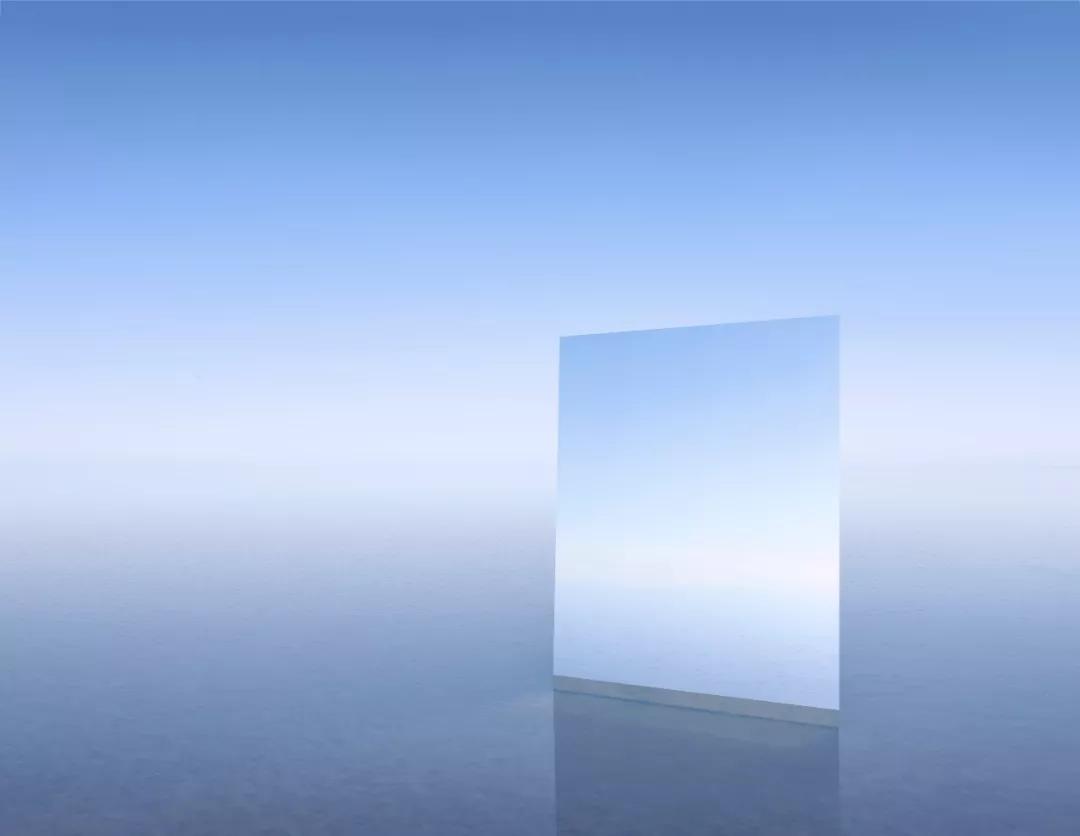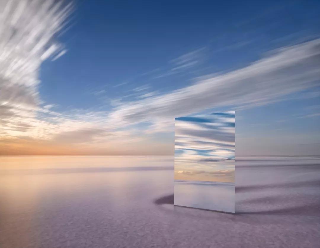 镜子斜斜地立在湖面,因此能同时捕捉到湖面和天空的景色,周围环境颇为荒凉,好像是自然环境正在虚荣的“顾镜自怜”。湖水中的镜子也将空间割裂的同时统一到了一个画面里,在这极简的画面中,镜子仿佛通往另一个世界的任意门,也为人们提供了无限的想象空间。