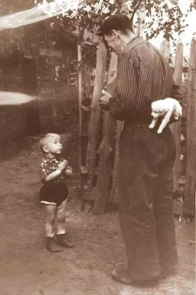 二战中,第一次收到新鞋的小男孩,抱着鞋子开心极了。他脚上的那双真的不能再穿了。