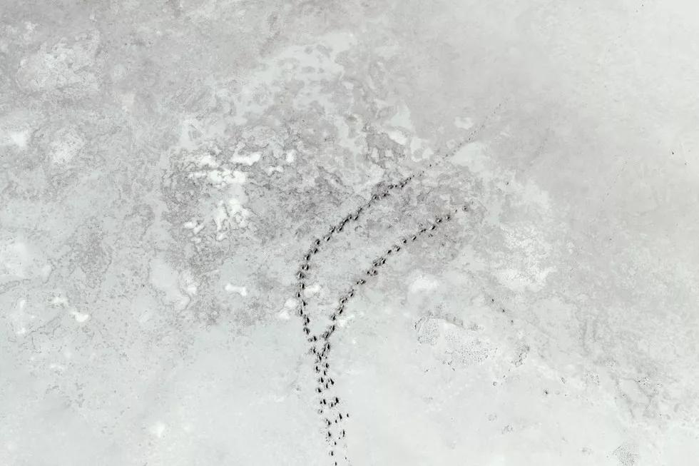 如火烈鸟、好望角大羚羊、甚至是一只在蔚蓝的海水中休息的乌龟。动物们行进时留下的痕迹和阴影都是他作品中重要的组成元素。