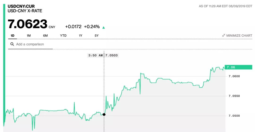2019年8月5日上午,在岸、离岸人民币兑美元汇率双双跌破“7”关口,刷新近几年最低记录。
