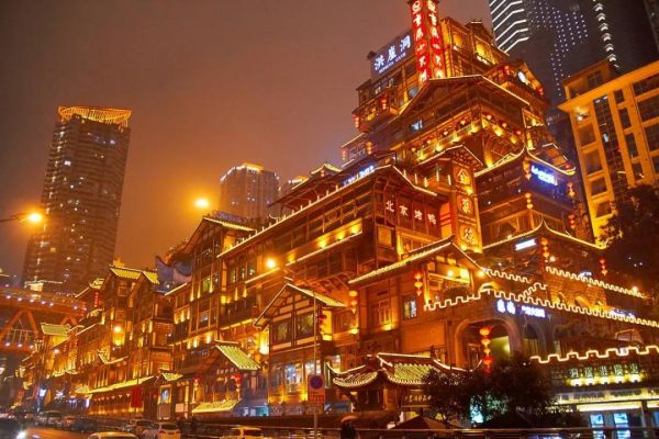 ● 约17:00游览【洪崖洞】,位于重庆直辖市核心商圈解放碑沧白路,长江、嘉陵江两江交汇的滨江地带,坐拥城市旅游景观、商务休闲景观和城市人文景观于一体。以具巴渝传统建筑特色的“吊脚楼”风貌为主体,依山就势,沿江而建,解放碑直达江滨。