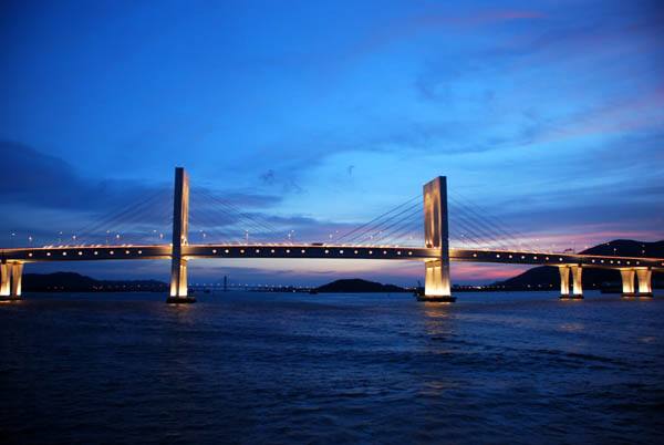简介:大桥在氹仔一段设分层回旋枢纽与澳门国际机场及九澳港的道路系统相连。澳门半岛一段,在外港码头与市区道路系统相连。往北则以800米长的高架海上走廊直通拱北海关,与珠海道路网相连。桥中两拱设行船通道,用钢索吊塔加高,使两处桥面离平均水面有30米高。吊塔之间距离是112.05米,塔顶距离平均水面56米,塔间航道为70米宽。在靠近凼仔处为单通道,在靠近半岛处为双通道,分别供来往内港和外港码头的船只通行。