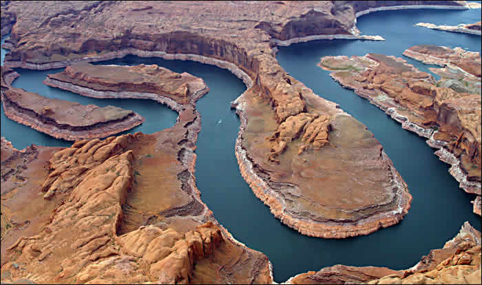 鲍威尔(POWELL)湖是为纪念那位第一个漂流此河并建议开发水利的先驱而命名的。它的面积是米德湖的两倍多,有各种红色砂岩、石拱、峡谷和万面碧波,其风景远胜米德湖,已成为美国西南部的主要国家度假区。