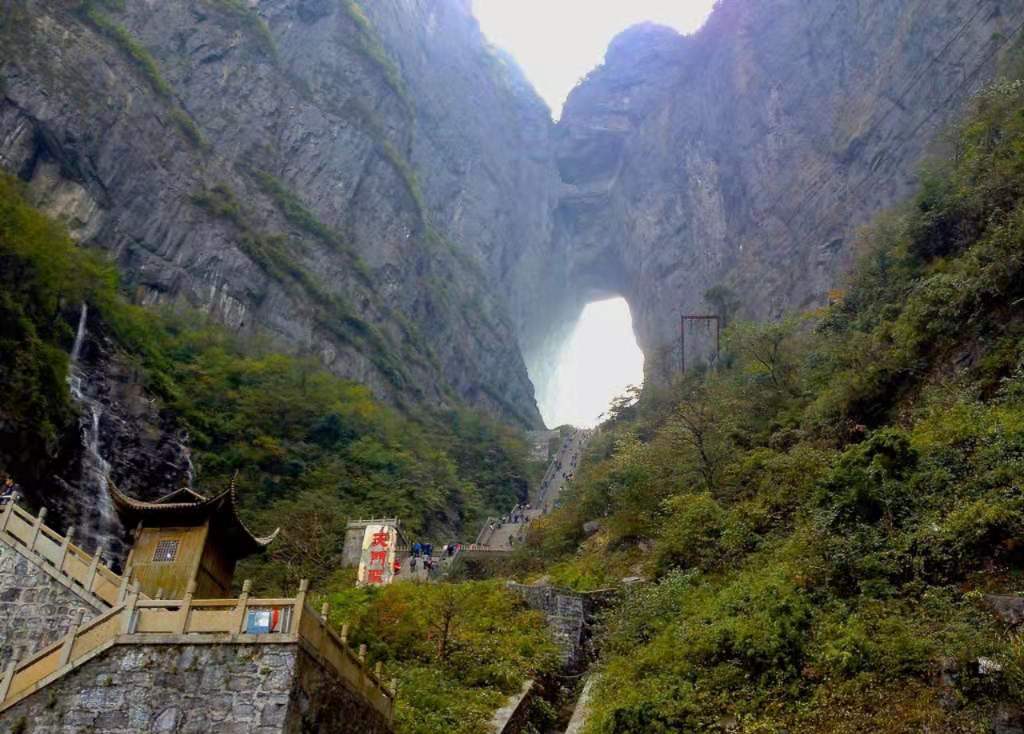 在古老的中国大地上,有一个人间通往仙界桃源的大山,武陵山脉之魂——天门山。您只要从天门山脚登上九百九十九级石阶梯,就会到达通往仙界的大门——天门洞。版权所有山东聊城聊之旅国际旅行社有限公司,转载必究!硕大的门洞足够现代人驾驶飞机穿越而过,是世界上最高的天然溶洞,该天门洞形成的时间比唐僧取经时收取的由石头爆出的大徒弟孙悟空还早500余年(公元263年溶洞形成)。它是天门山中一块大石块由于吸聚天地之灵气喷溥洞开而成。从此,凡人间伟大人物仙逝,该天门山上不管是晴空万里还是满天星斗,都瞬间电闪雷鸣,风雨交加,犹如天门洞落泪,倾盆而下……泪水沿着绝壁山崖瀑布而泻,远远望去,似天上银河下九洲。这现象至今仍无法开解!