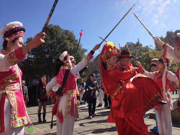 在周城至今仍能看到白族婚礼中古老而典雅的新娘装束。新娘头