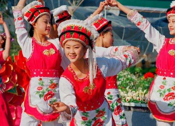 女子腰身苗条、婀娜,衣着色彩鲜艳、明快又大方。尤其是她们的绣花包头,体现了大理的“风花雪月” 四景。看,弯弯的包头像洱海里的新月;艳丽的朵朵绣花代表了上关花;顶端洁白的缨须像苍山顶的白雪;耳际垂下的缨穗随风飘洒,显示了下关的风。