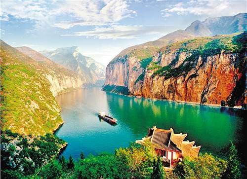 瞿塘峡谷窄如走廊,两岸崖陡似城垣,郭沫若过此发出“若言风景异,三峡此为魁” 的赞叹。瞿塘峡西入口处,白盐山耸峙江南,赤甲山巍峨江北,两山对峙,天开一线,峡张一门,故称夔门,古称瞿塘关,形成“西控巴蜀收万壑”,瞿塘峡锁全川水的险要气势。