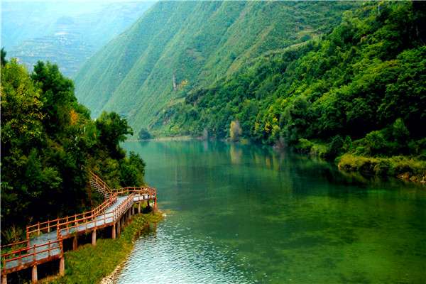 官鹅沟水美。13个大小不等、形态各异的湖泊,尤如一串绿色的珍珠镶嵌在沟内,湖水清澈透底,随湖底地貌高低呈不同颜色,那些倒映在湖中的古树象一条条巨龙卧在湖底。蓝天白云和青山古树,映入湖中,使天地浑然一体,没有界限。