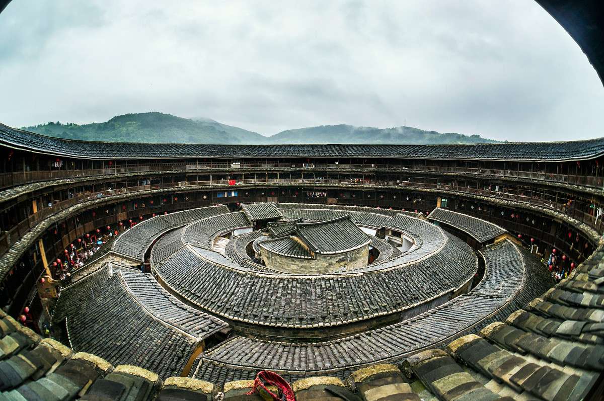 依山傍水,面前是一片开阔的田野。这里有数十座大大小小、或圆或方的土楼,错落有致高低起伏,组成了一幅色彩斑斓的土楼画卷。承启楼的楼名是今人江静波教授补题,楼门联是:“承前祖德勤和俭,启后子孙读与耕。”承启楼从明代崇祯年间破土奠基,到清代康熙48年(1709年)竣工。三代人经过八十一年的努力奋斗,终于建成这座巨大的江姓家族之城。版权所有山东聊城聊之旅国际旅行社有限公司,转载必究!相传在建造过程中,凡是夯墙时间均为晴天,直到下墙枋出水后,天才下雨,承启楼人有感于老天相助,所以又把承启楼称作“天助楼”。