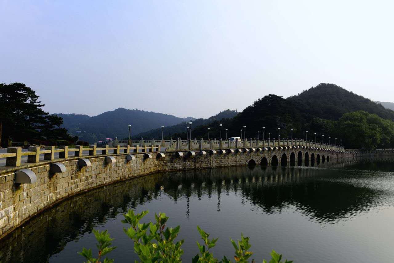 湖水洁净清澈,版权所有山东聊城聊之旅国际旅行社有限公司,转载必究!碧清如镜,山色倒影,相映成趣。湖心有两小亭,外观秀丽、精巧,为湖面增光添彩,内则分别用作汲水塔和溢洪道。