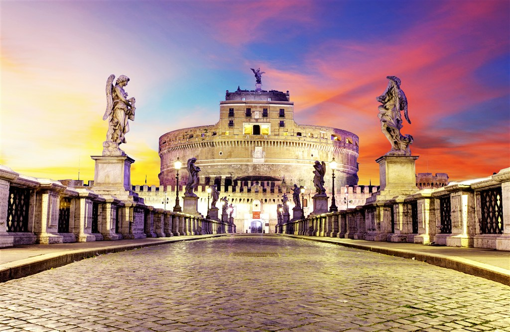 圣天使堡(Castel Sant’Angelo),位于意大利罗马台伯河畔,古罗马地区的最西端,又称哈德良陵墓(Mausoleo di Adriano).有数条桥可通往台伯河西岸,较重要的一是伊曼纽尔二世桥(Ponte Vitttorio Emanuele Ⅱ),另一就是前往圣天使堡的著名桥梁(Ponte Santa Angelo)。由Bernini设计的这座桥可说是巴洛克式装饰艺术杰作,不过桥上诸天使像中唯二两座由Bernini亲手雕成的雕像,已被移至Santa Adrea delle Fratte教堂内妥为保存,改置两座复制品于桥上。