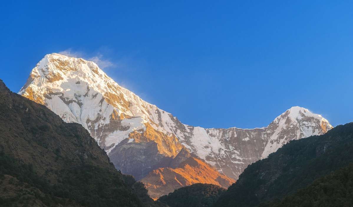 鱼尾峰虽然不是尼泊尔最高的山峰,但却成为尼泊尔的标志。从波卡拉的费娃湖附近,可以看到这座圣山和周围峰群,突出于较低的山峦之上。