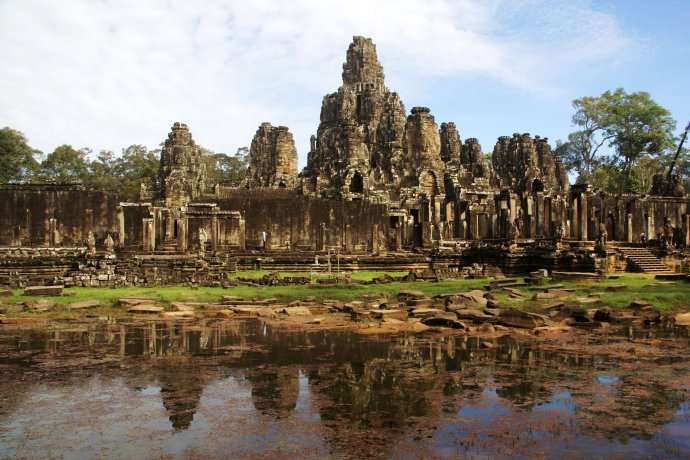 巴戎庙 位于柬埔寨暹粒,吴哥城内最为出名的要数巴戎庙中的佛塔了,巴戎庙位于吴哥城的中心位置,巴戎庙是由一组共49座小宝塔围绕中央尖塔构成的建筑群,这些塔在佛语里又被称做浮屠,每一座塔的四面都雕刻着巨大的佛面,也正因为如此,这些塔又被称作佛面塔,上面的佛被称为四面佛。