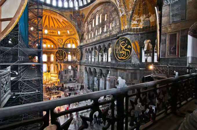 圣索菲亚大教堂是罗马帝国时期的基督教堂。它是一个气势宏伟的长方形石头建筑,上面巨大的穹顶,直径31米,离地面55米。底部四周有40个大玻璃窗,4座雄伟的拱门,是典型的拜占庭建筑。1453年,拜占庭帝国灭亡后,信奉伊斯兰教的土耳其人在教堂外修建了4座宣礼塔,将这座千年历史的大教堂改为清真寺。1935年,土耳其共和国建立后,将它改为博物馆。