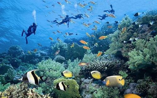 涉足观鱼:即使没有受过潜水训练,也绝对可以享受潜水观鱼的乐趣。戴上面罩,扑在海面上向下看,近距离欣赏美丽的珊瑚,五颜六色的热带鱼从身边游过,尤其是红色的大鱼,很让人惊奇,30米外便有如悬崖般的落差,但这里也是鱼儿最多的地方。在阳光的照射下,海底世界美得如梦如幻。一会儿,一大群黑色的鱼群游过来,不一会儿又有一大群白鱼从身边穿过。运气好的话,可见到小鲨鱼和魔鬼鱼。