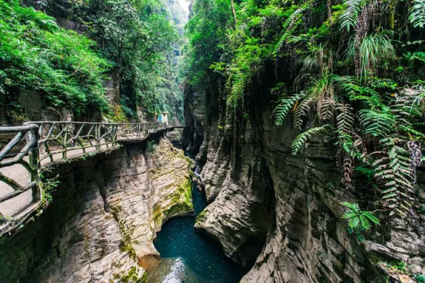 “险、奇、古、野、秘、秀”的“地心天堑、地心奇观、巴盐古道、地心洞天、地心秘境、巨猿暗河”景区六大游览区峡谷幽深、天桥凌空,雄关漫道、仰天如缝,石臼涡槽、船悬浮游。亘古地心谷犹如深山中切开的溶洞,其天堑之窄、切割之深、熔岩发育之美,心怡神旷,天下罕见,其奇特的“山、谷、道、洞、缝、水”景观与显著的立体气候,众多的珍稀动植物,充足的负氧离子,原生态的旅游环境,让人顿生时空穿越之感,唯美风度而震撼