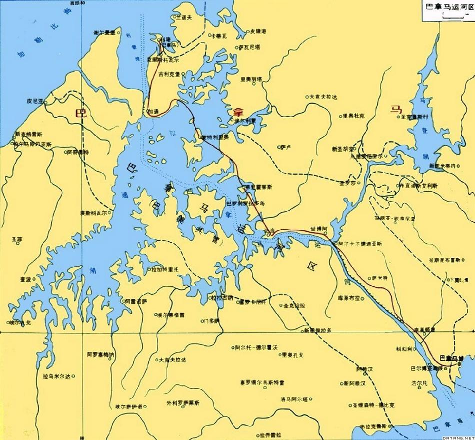 船只从大西洋通过运河到太平洋时,先经由利蒙湾(Limon Bay)内长约11公里的进口航道到达加通水闸。在加通有连续3座水闸将船只升高26公尺(85呎),进入加通湖。加通湖系由查格雷斯河(Chagres River)上的加通水坝拦蓄而成,湖巴拿马运河地图水源自阿拉胡埃拉湖(Alajuela Lake, 又名马登湖〔Lake Madden〕;由马登水坝拦蓄而成),面积425平方公里(164平方哩),版权所有山东聊城聊之旅国际旅行社有限公司,转载必究!水深14~26公尺(46~85呎)不等,至甘博阿(Gamboa)长约37公里(23哩)。切穿大陆分水岭的盖拉德人工渠(Gaillard Cut, 又名库莱布拉水道〔Culebra Cut〕)就是从甘博阿开始的。这条人工渠平均水深约13公尺(43呎),延伸约13公里(8哩)至佩德罗米格尔水闸(Pedro Miguel Locks)。佩德罗米格尔水闸将船只降低9公尺(30哩),进入高於海平面16公尺(52呎)的米拉弗洛雷斯湖(Miraflores Lake)。船只通过一条长约2公里(1哩)的水道,在米拉弗洛雷斯由两级水闸降低至海平面。运河的最後一段是挖掘而成的进口航道,长约11公里(7哩),船只经此进入太平洋。运河全程的底宽至少150公尺(500呎);在加通湖,航道的宽度不等,介於150公尺(500呎)至300公尺(1,000呎)之间,而在米拉弗洛雷斯湖段航道宽度为225公尺(740呎)。