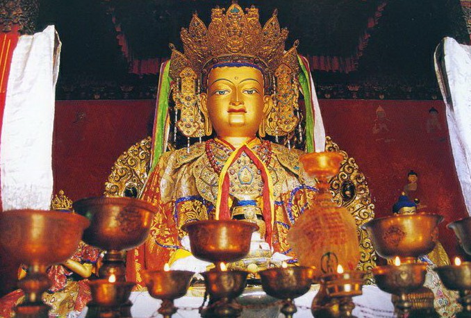净室门口两侧还供有四大天王泥塑像。最后部是佛殿,内2柱,无柱础,面积23。5平方米。大柱表面用麻绳缠绕之后又用2~3厘米的泥皮涂抹,可能是防腐、防火的措施。柱头雕有莲花宝座,柱头小栱上则无装饰,具有明显的早期特点。四壁的壁画多为线描盘腿坐形象,笔法流畅生动。大殿的墙壁均用大石块夹小石片砌成,厚1~1。3米。殿内供有尼泊尔墀尊公主带来的铜鎏金不动金刚佛和八大随佛弟子泥塑像,以及两大忿怒力士、宗喀巴塑像。佛殿后部和两侧还绕以密闭回廓,偏窄、较高,具有早期布局特征。神殿第二层前前为僧舍,中部为大经堂天井,天井之后为供佛大殿,6柱,内供桑杰鲁王甲后、十六尊者及经书;里面还有一大殿,8柱,内供药师八如来和《甘珠尔》佛典,北面供奉有救度母及其他佛像。神殿第三层前面为达赖喇嘛到该寺的专用住房,共6间。后部则为金顶殿,殿门向东,面积约54。5平方米,内有明柱两排8根,左右开小窗。殿左右及后部有一周狭窄回廓,以木栏相围。金顶为汉式风格,属歇山式,以斗栱承托;金顶垂脊末端套有羯摩鱼头,是为套兽。殿内门窗壁画、柱子等则是藏式风格,体现了藏汉建筑的巧妙结合。