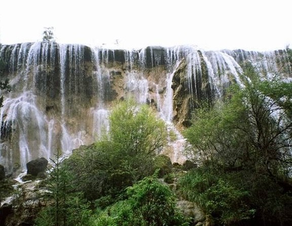 凌空而泻的瀑布,象银河倒悬,坠至半空,忽被峭石拦腰斩断,刹时雪浪飞溅,宛如千万串断线的珍珠,纷纷扬扬,沿悬立千纫的绝壁陡然下坠,落进不见底的深渊,发出惊天动地的狂啸。而河水却象凶猛的野兽在咆哮,发出震耳欲聋的吼声,仿佛整个峡谷在颤动。每到日落西山,“老虎嘴”彩虹缭绕,雪峰顶上绯红一片,迷离变幻,奇胜不可名状。